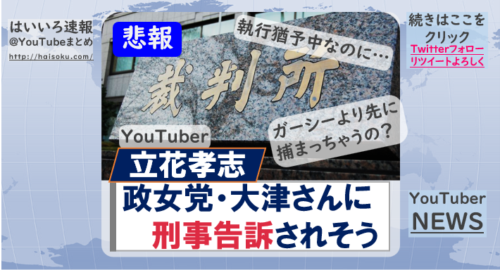 【【悲報】立花孝志さん、政女党・大津さんに刑事告訴されそう…ガーシーよりお先に実刑か?】の続きを読む1: はいいろ速報@youtubeまとめ 2023/04/29(土) 00:24:20.82 ID:qMxIOkUk9https://www.tokyo-sports.co.jp/articles/-/261513?page=1