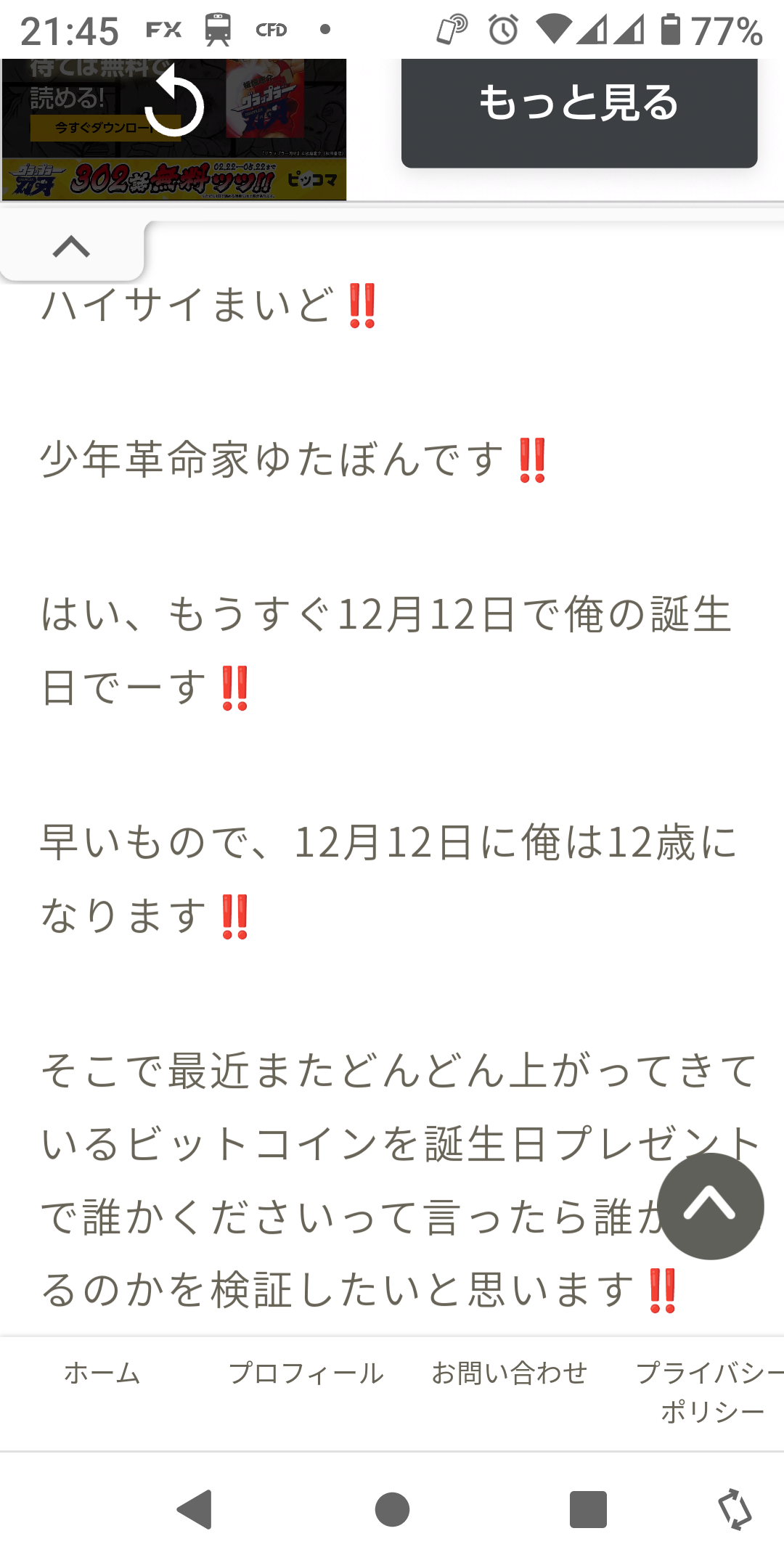 この日、Xで「【速報】とんでもない事になりました!実は2017年、僕がまだ8歳の時にお年玉でビットコインを買ったんです。その時は1ビットコインが63万円だったのに、3日前に1,100万円を突破していてビックリしました!」と投稿。「お金と経済についても勉強しながら、人生は冒険だ!」とつづった。