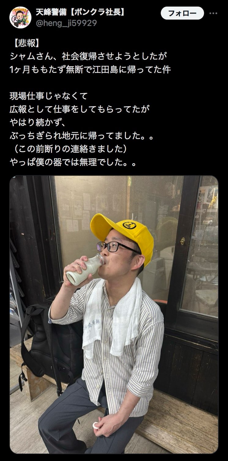 なお1ヶ月未満でバックれて淡路島に帰宅した模様