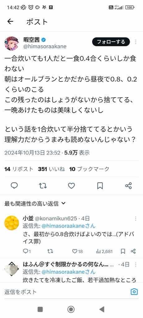 なんか1合炊いて0.6合食べて残り捨てるみたいなこと言ってませんでした?