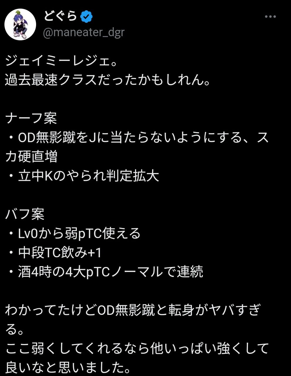 あんま強くないって評価のキャラが持ってる壊れ技をナーフした方がいいと言ったらこうなった