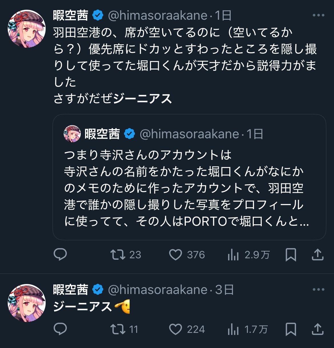 (暇空さんの中では)堀口君は様々な『コード』をネットの至る所に仕込んでいて、それを『発見』した時、最大の感嘆の一つとして「ジーニアス」という表現を使っているらしい