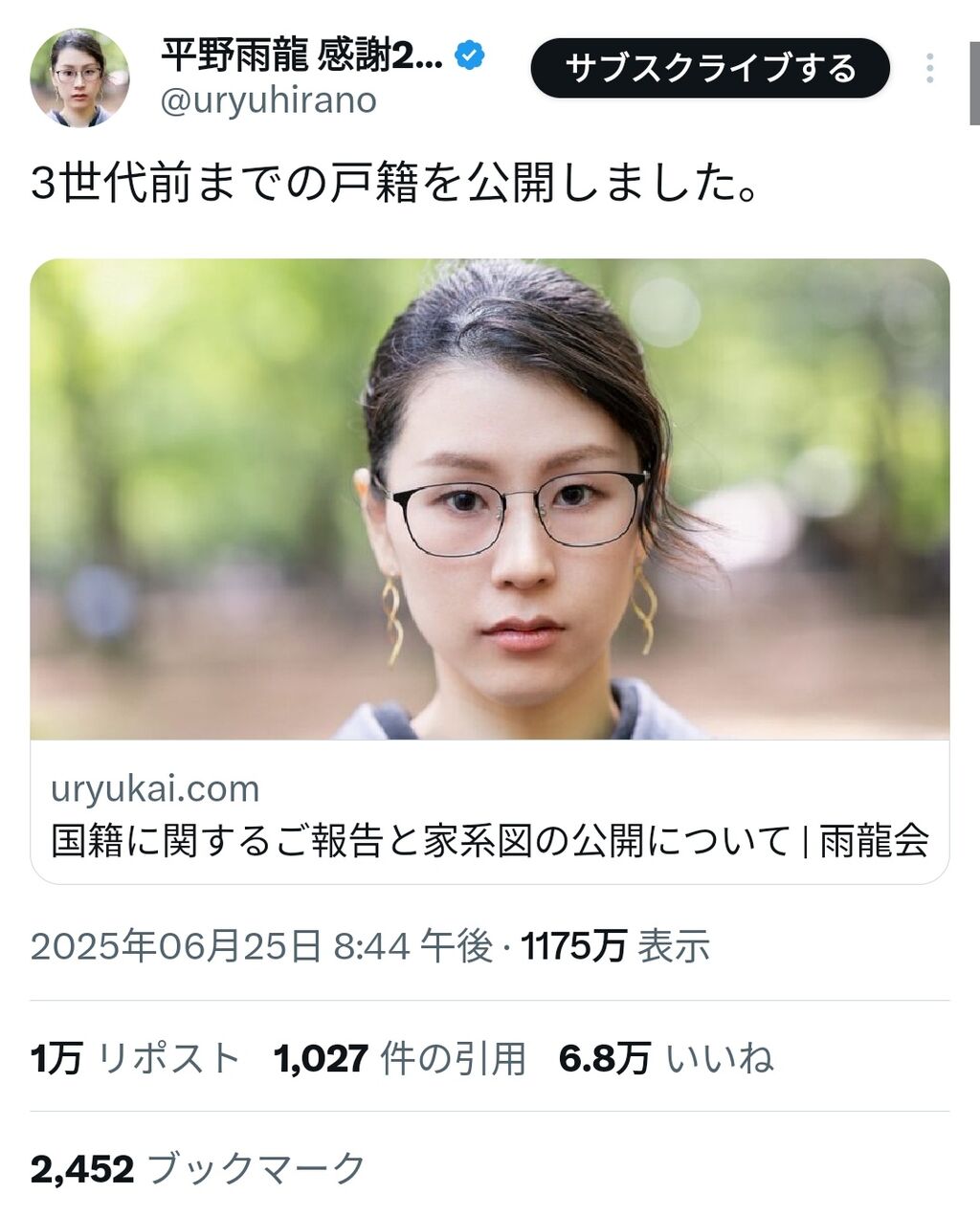 一方で、平野氏は複数回にわたり戸籍謄本と家系図を公開。2025年6月25日および7月27日に公表された資料では「荻野鈴子」が本名であること、3親等までに帰化人が存在しないことが明確に示されている。「帰化ではない」ことを自ら証明した形だ。