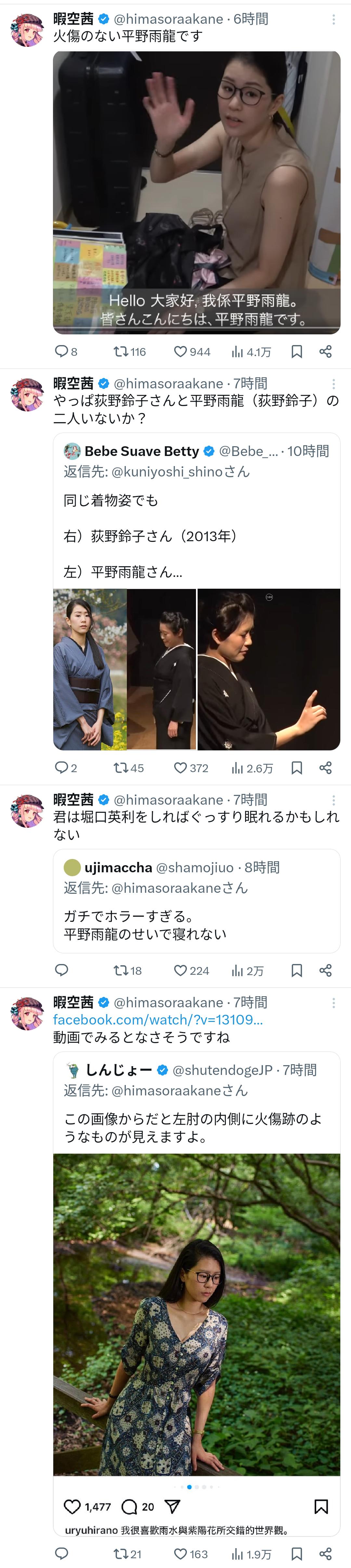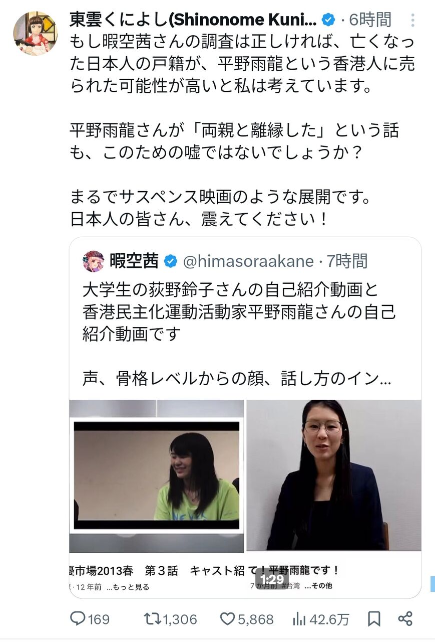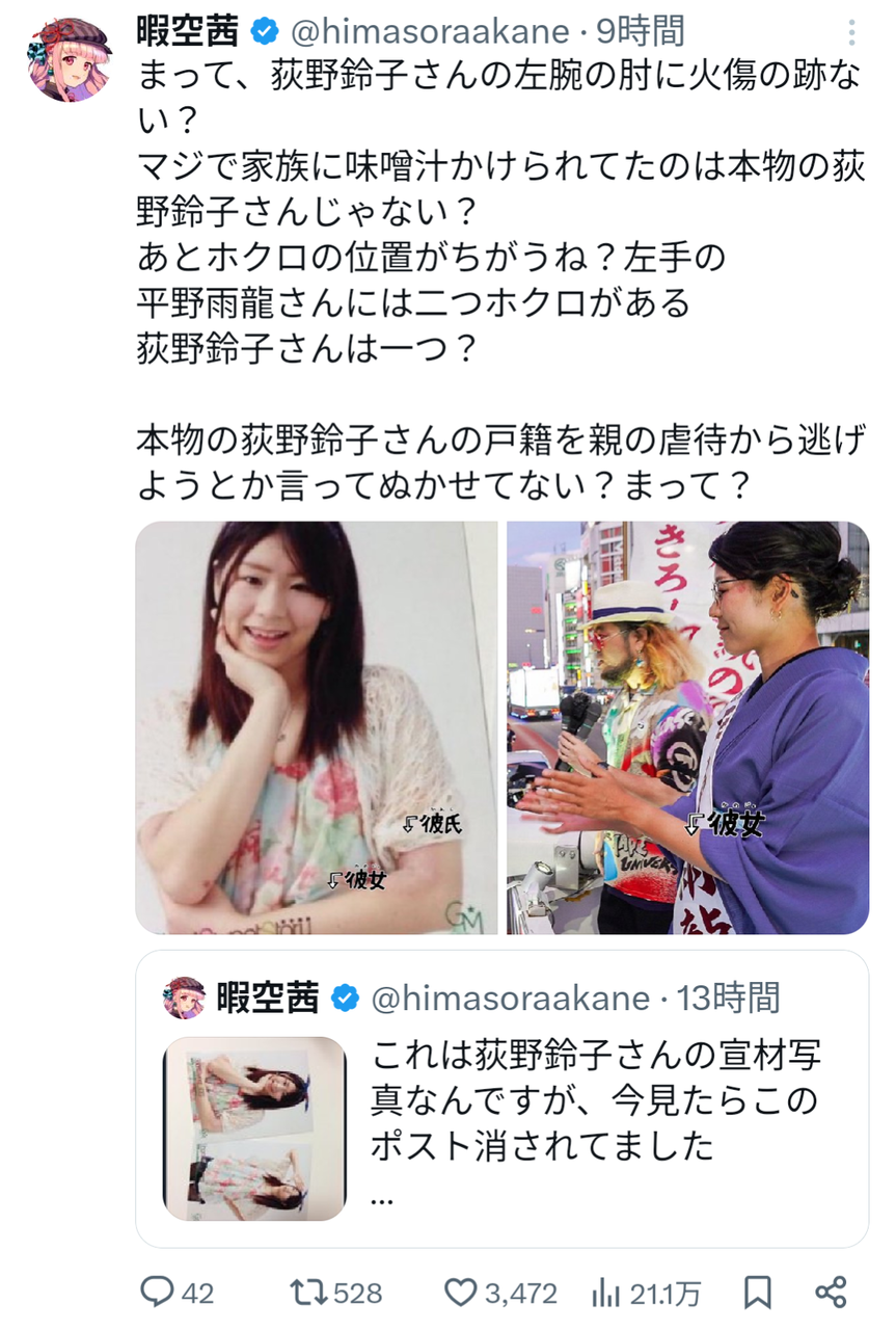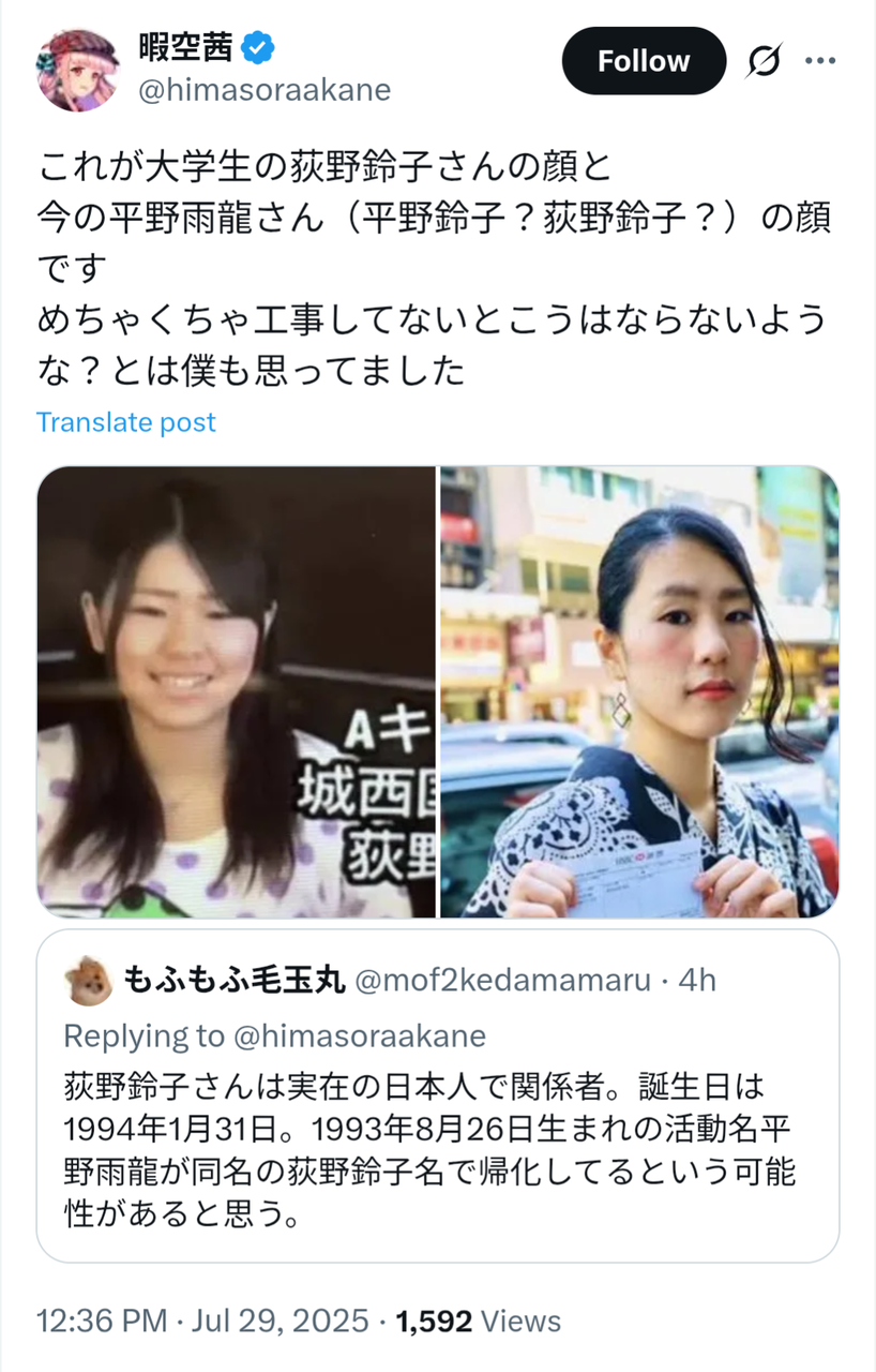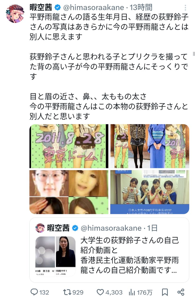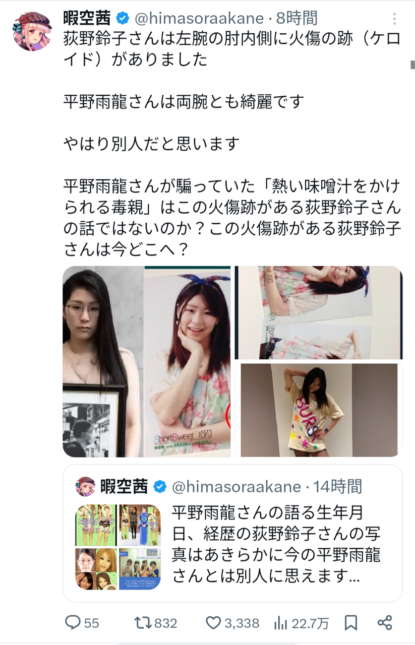 同時に、インフルエンサーの暇空茜氏が、平野氏の過去の名義とされる「荻野鈴子」名義での大学生時代の自己紹介動画を引用し、「顔・声・喋り方、全くの別人ではないか」と指摘したこともある。