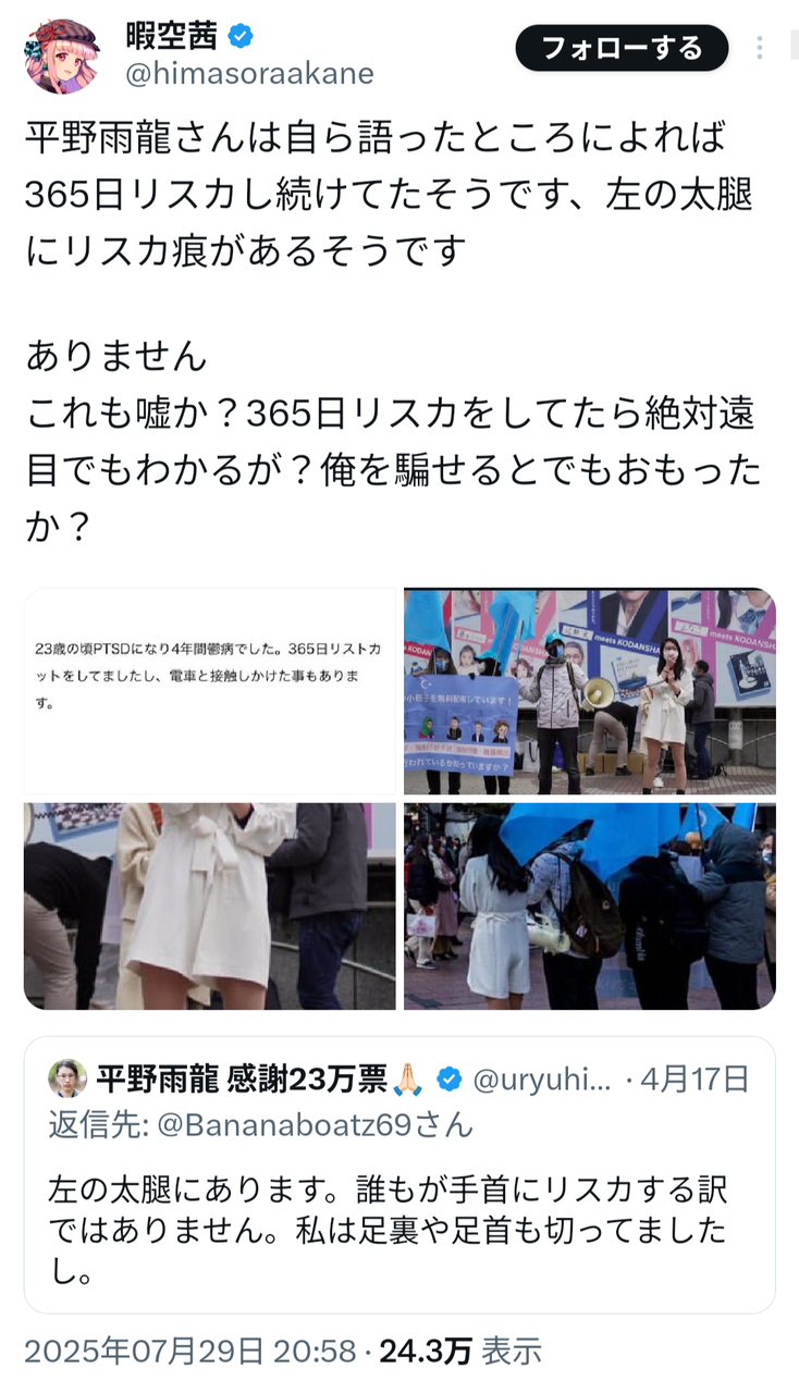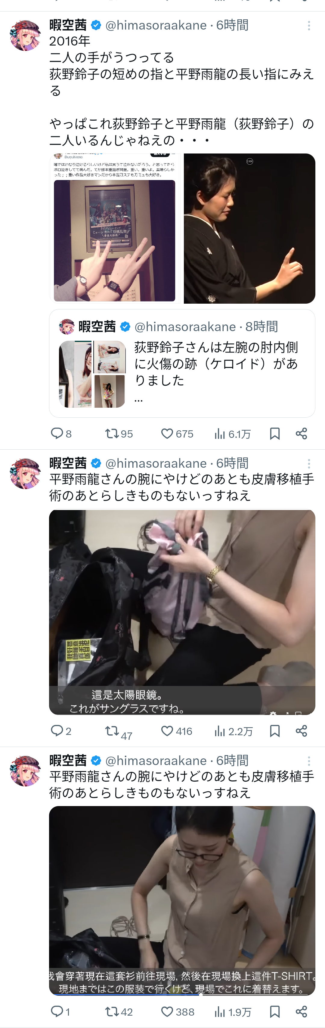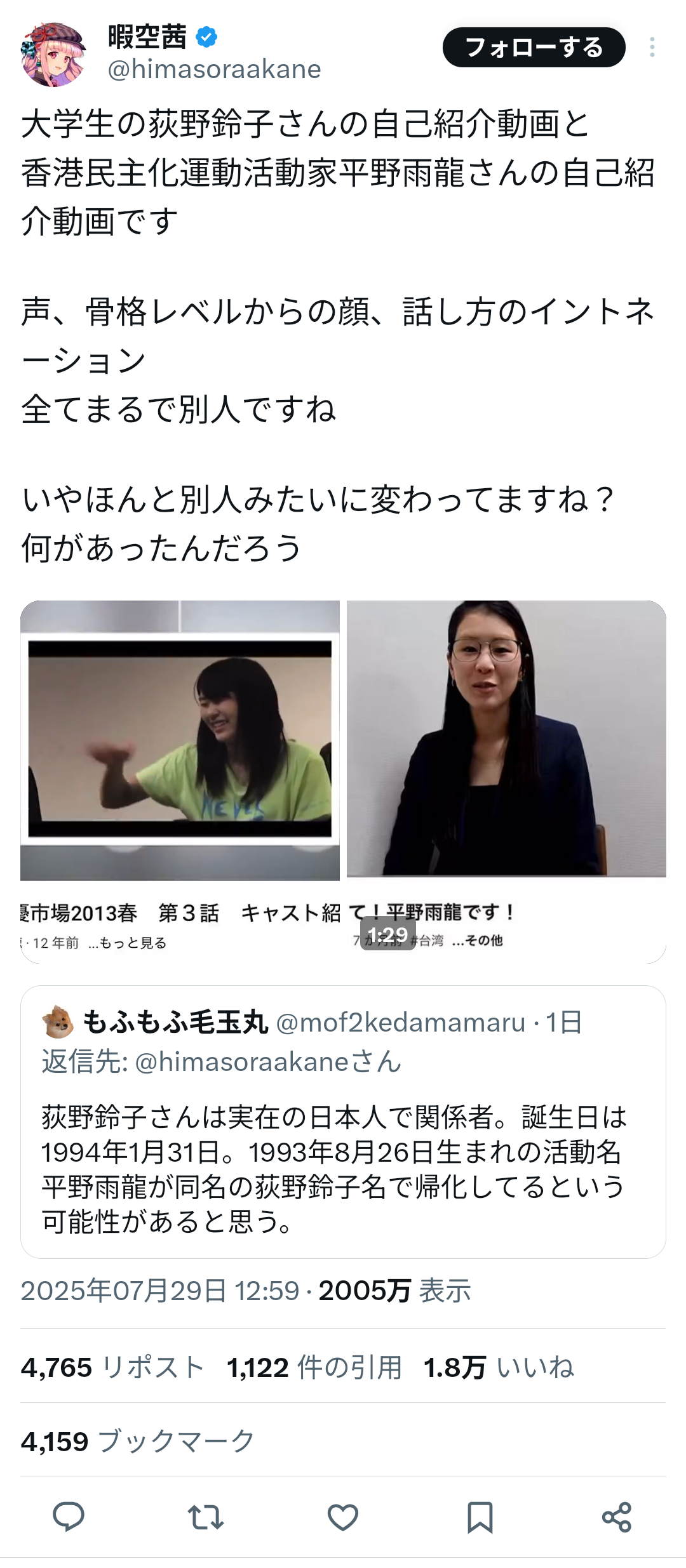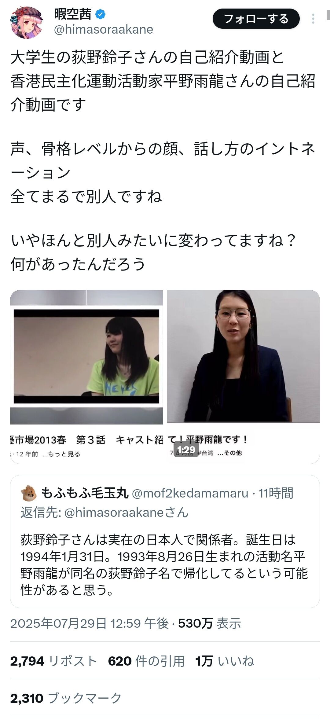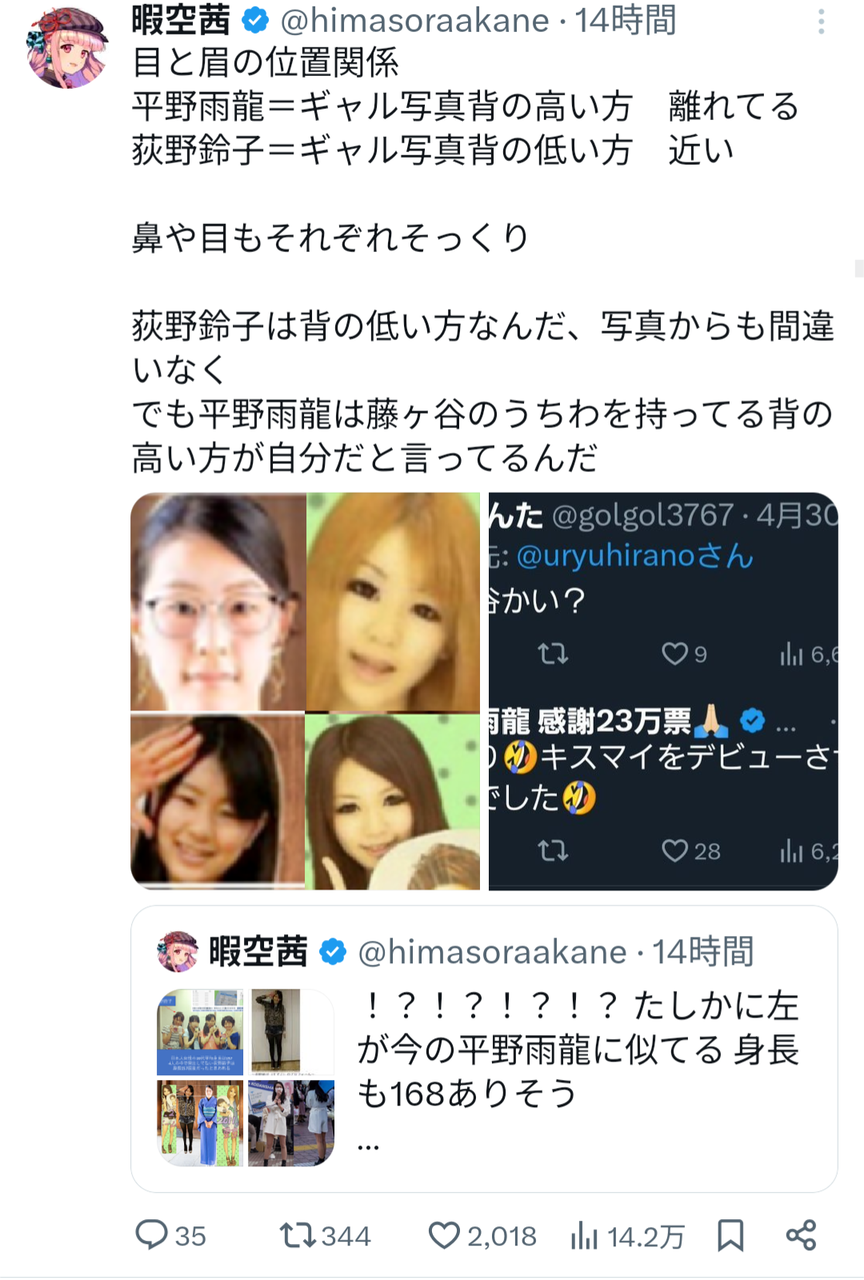 同時に、インフルエンサーの暇空茜氏が、平野氏の過去の名義とされる「荻野鈴子」名義での大学生時代の自己紹介動画を引用し、「顔・声・喋り方、全くの別人ではないか」と指摘したこともある。