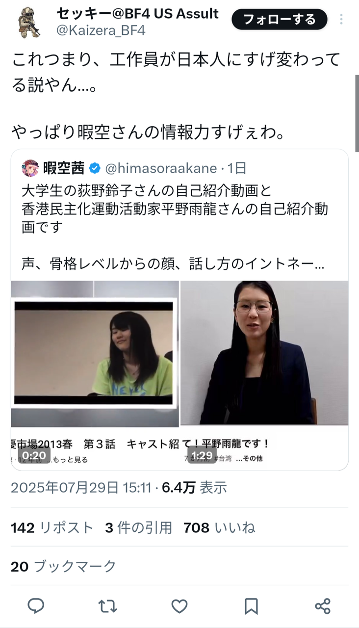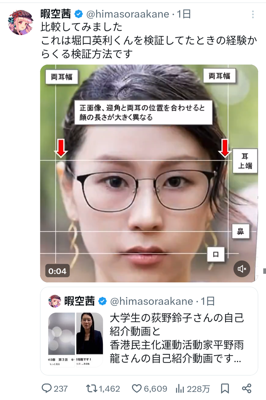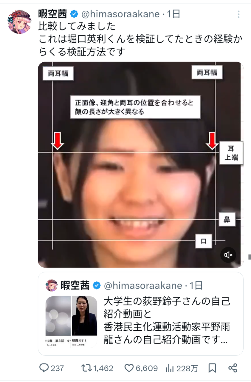 比較された動画は、いずれも本人による自己紹介とされているが、その見た目や話し方の違いが一部のユーザーに強い違和感を与えている。暇空氏は「声、骨格、イントネーション、すべて違う」と明言し、「何があったのか」と疑念を示した。