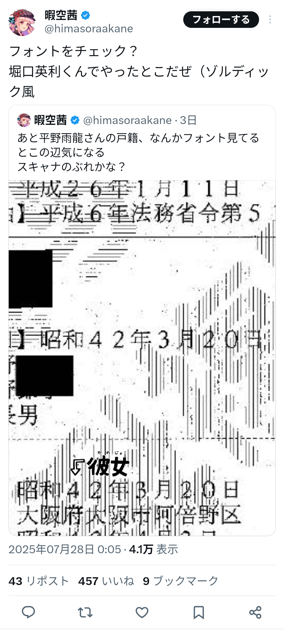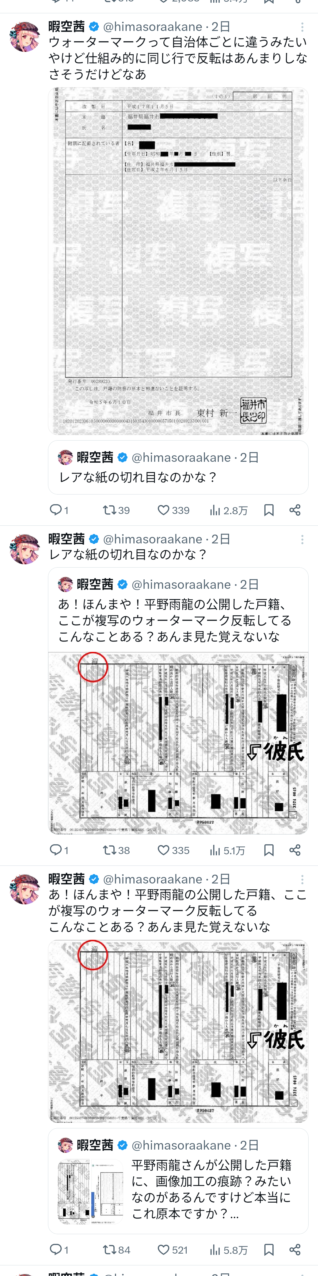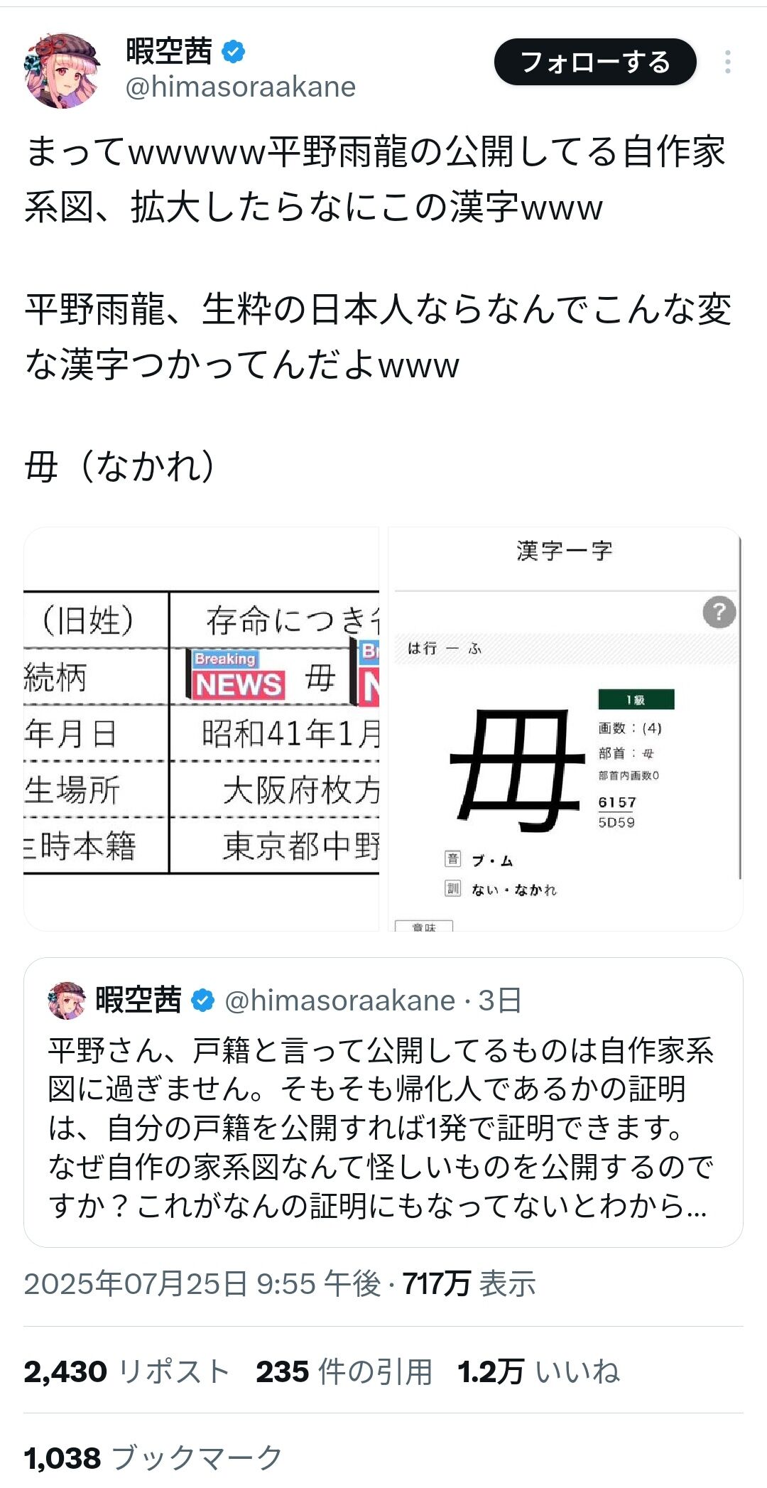2.暇空茜氏「家系図の漢字がおかしくない?平野雨龍は帰化人では。ちゃんと戸籍見せるべきでしょ」