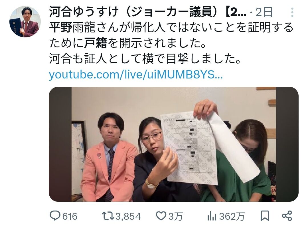 2025年の参院選で無所属ながら23万票を集め、政治的存在感を高めた平野雨龍(ひらの・うりゅう)氏に対し、「帰化人ではないか」とのネット上の憶測が根強く続いている。その疑念は、氏の名が中華風に見えることや、対中強硬路線という一貫した主張とも相まって、戸籍や出自に関心を呼び起こしている。