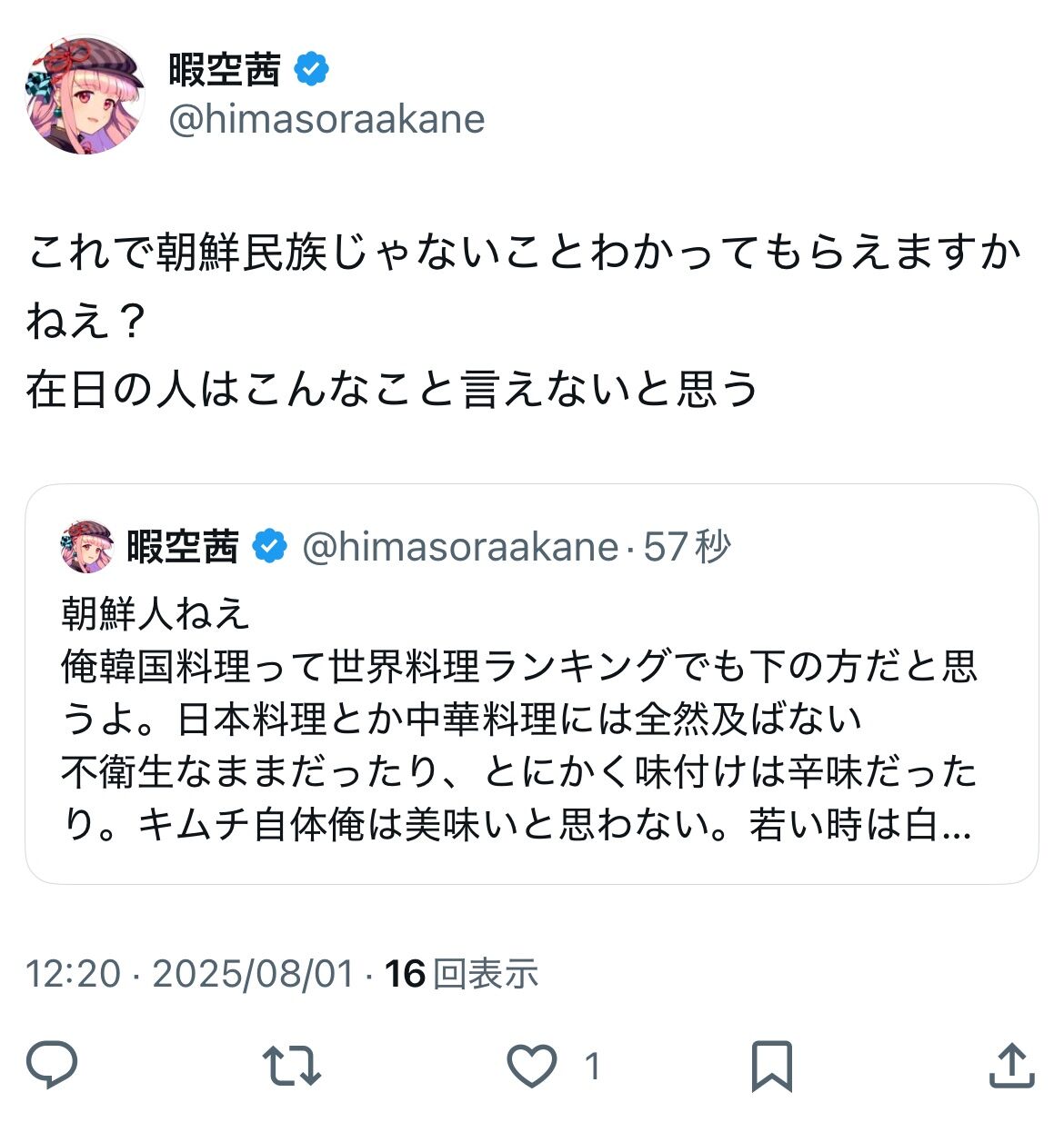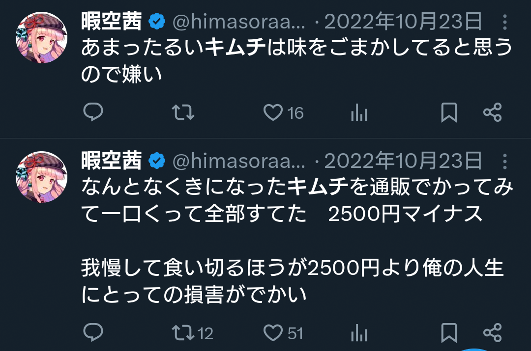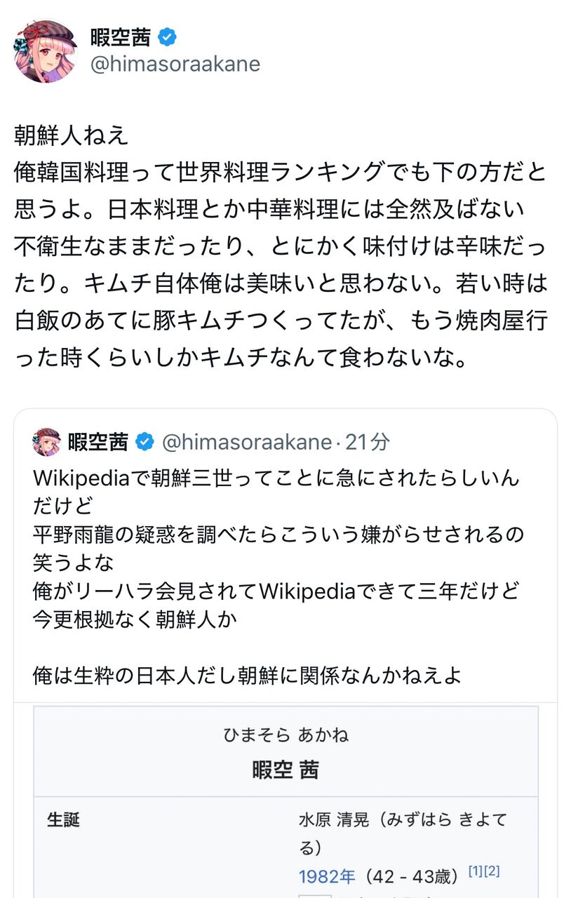 暇空茜が在日疑惑を否定。キムチ嫌いを理由に、自らの日本人であることを主張するが、反響は様々。