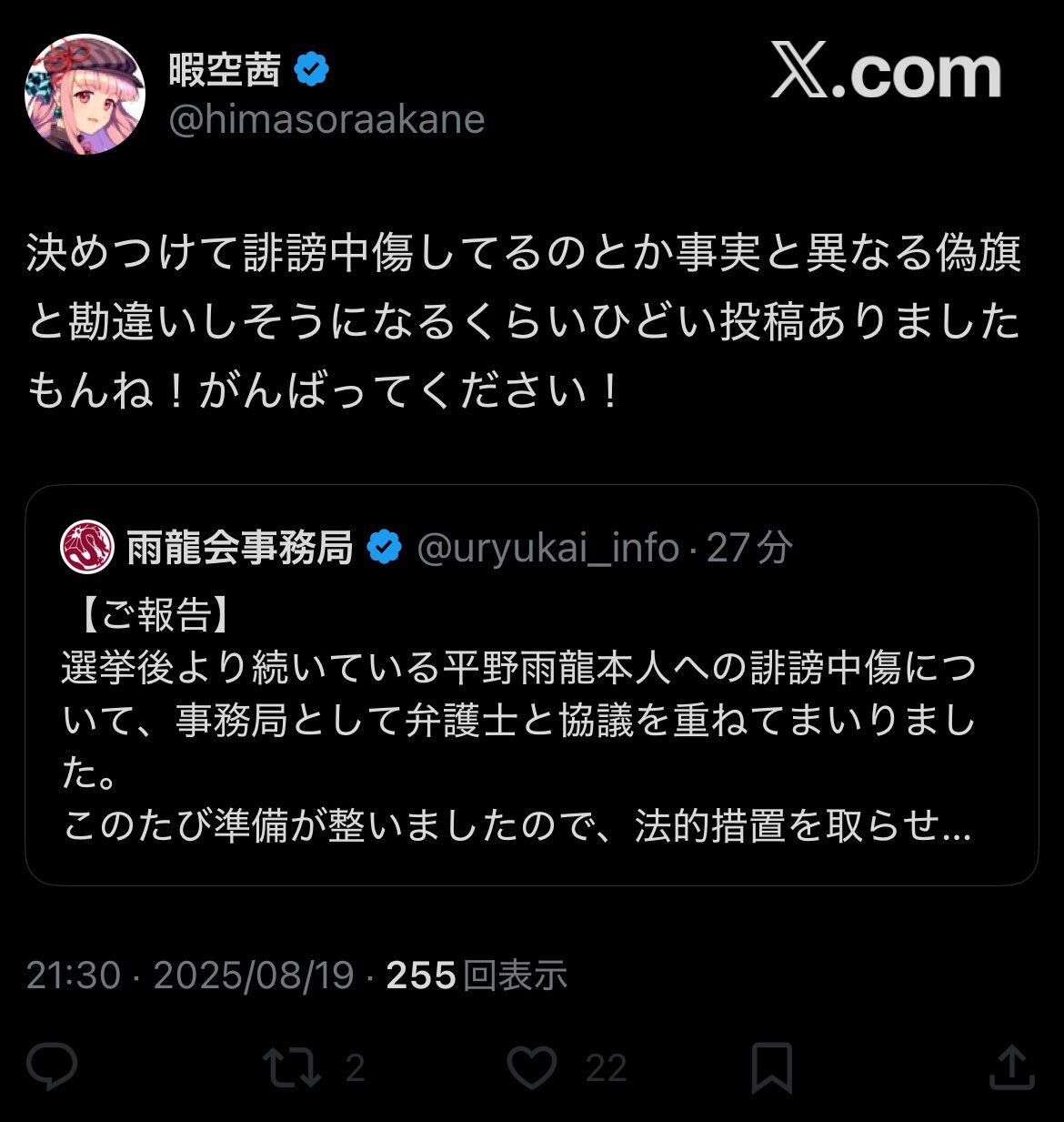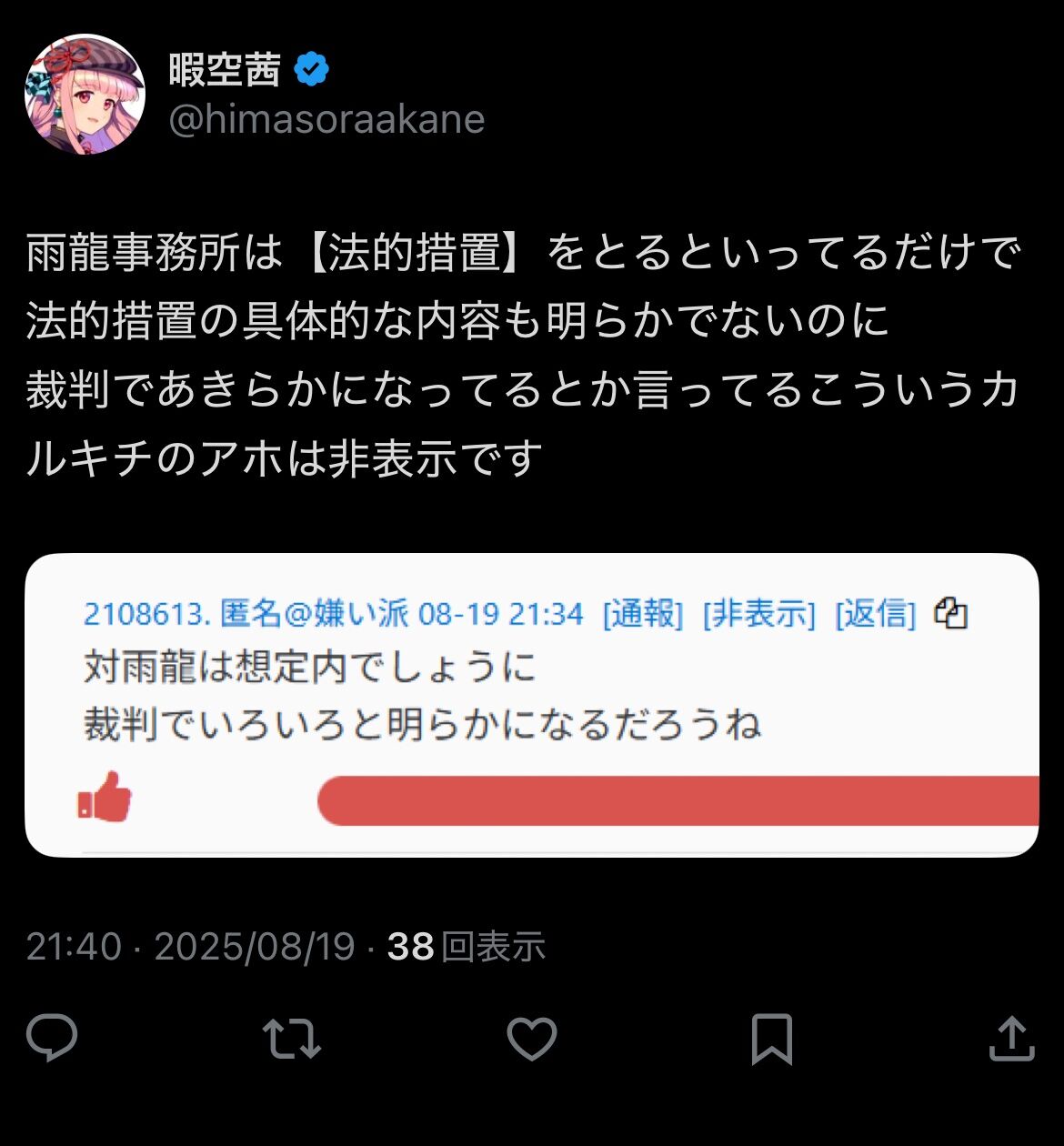 【朗報】暇空さん、平野雨龍による法的措置を応援