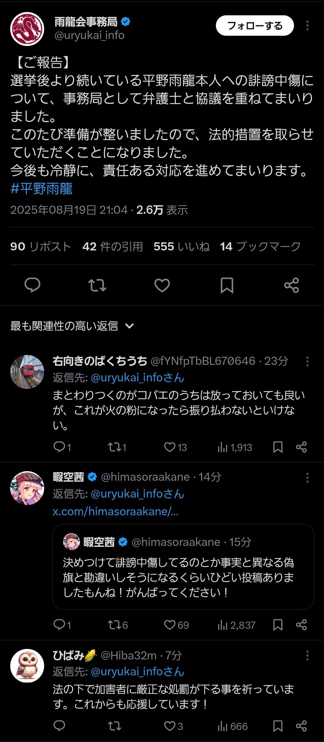 平野雨龍が誹謗中傷に対抗し法的措置を発表。暇空茜はそれを応援し、ネット上で反響を呼んでいる。