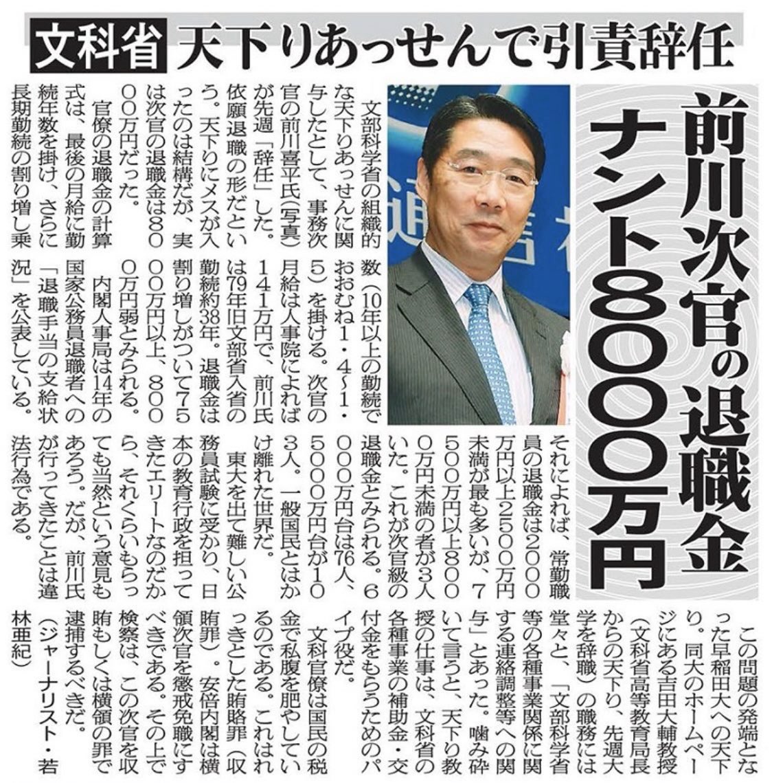 元文部科学省の事務次官様が、自ずから失敗を認めたんや。どう失敗の責任を取るつもりなんだろう。