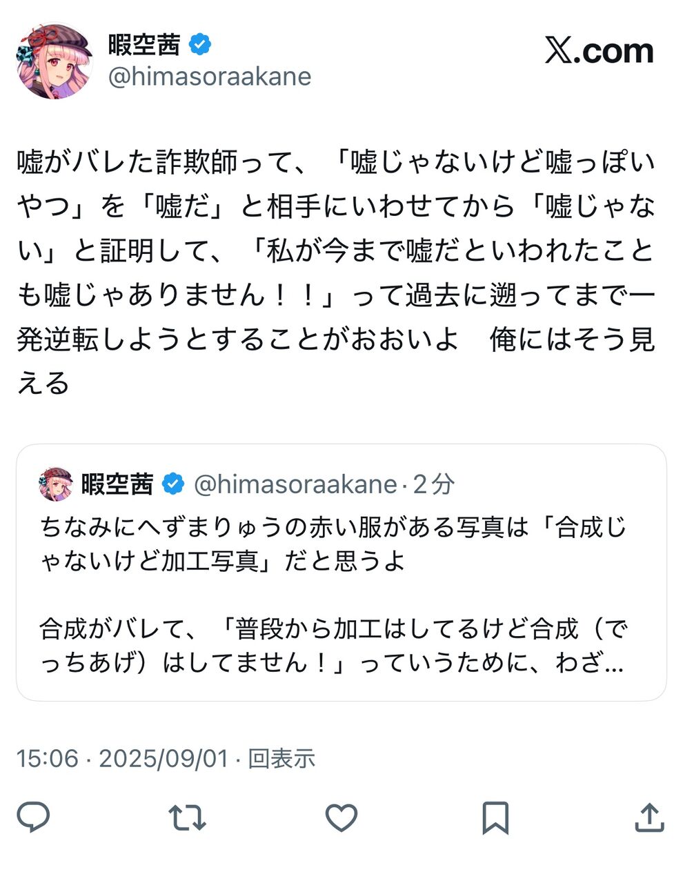 >嘘がバレた詐欺師って、「嘘じゃないけど嘘っぽいやつ」を「嘘だ」と相手にいわせてから「嘘じゃない」と証明して、「私が今まで嘘だといわれたことも嘘じゃありません!!」って過去に遡ってまで一発逆転しようとすることがおおいよ 俺にはそう見える