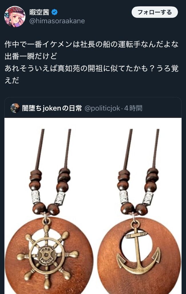 暇さんが出した真ん中にone pieceってあるペンダント、真如苑と全然関係ないワンピースあやかりグッズだと思うよ