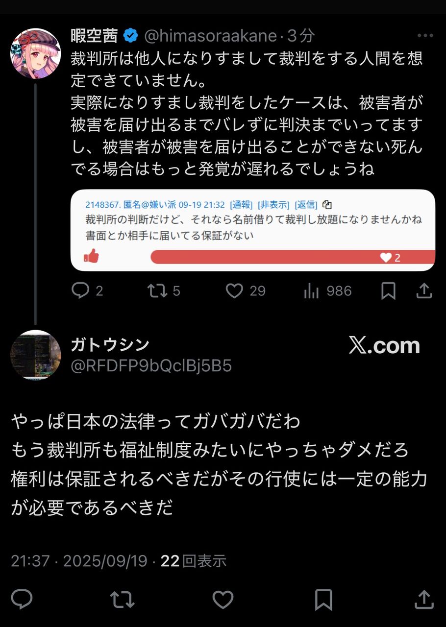 暇さんは故意になりすまし訴訟してるからやべーって話をしてるのに、アノンは「福祉制度」だの「一定の能力」だの原告の能力不足がやべーって話をしてるじゃん