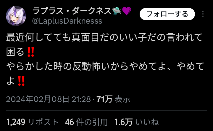| プロジェクト YouTube ラプラス・ダークネス(英: La+ Darknesss、中: 拉普拉斯 暗黑)は、日本のバーチャルYouTuber、バーチャルアイドル。女性バーチャルYouTuberグループ・ホロライブの6期生「秘密結社holoX」のメンバー(総帥)。 誕生日は5月25日。身長139センチ。挨拶は「刮目せよ!!」など。… 32キロバイト (3,425 語) - 2025年9月16日 (火) 11:25 |