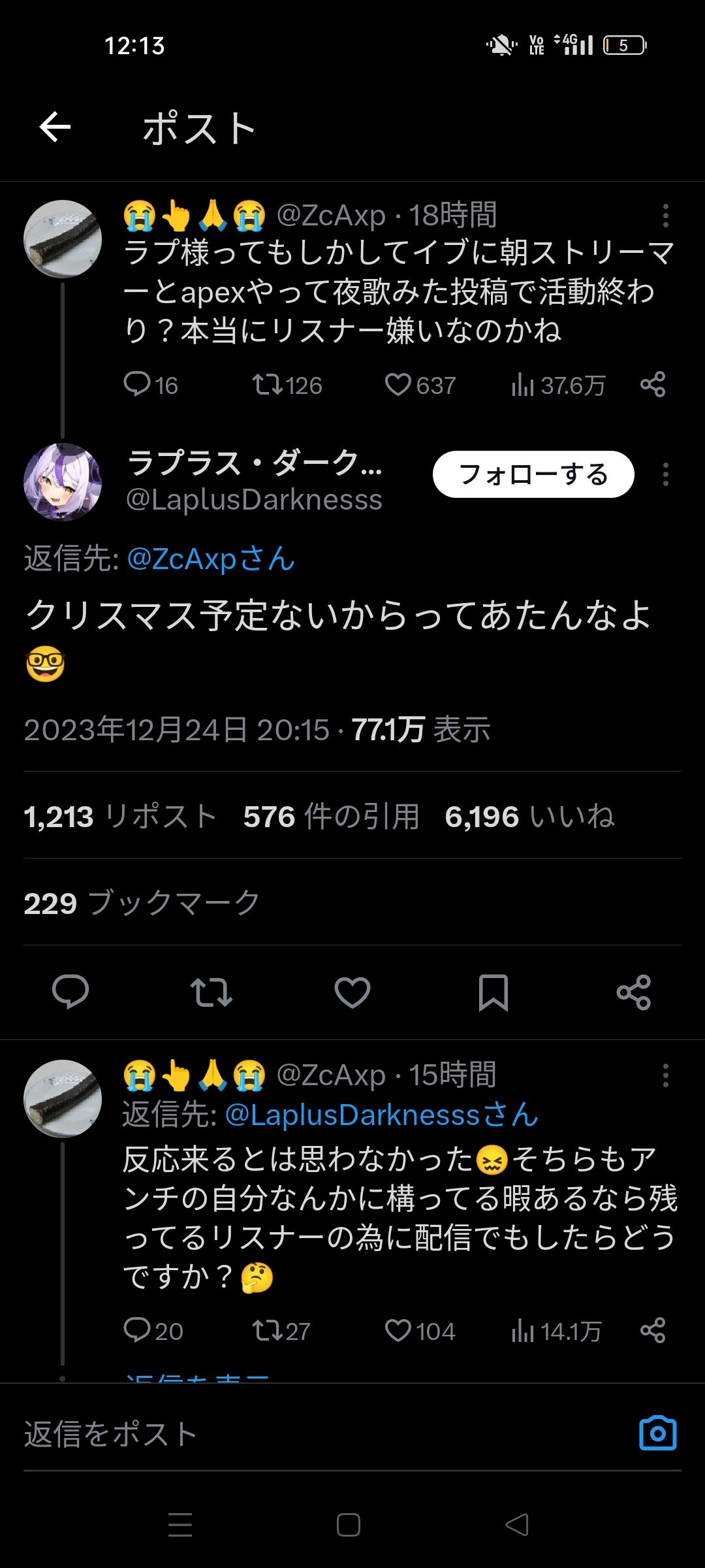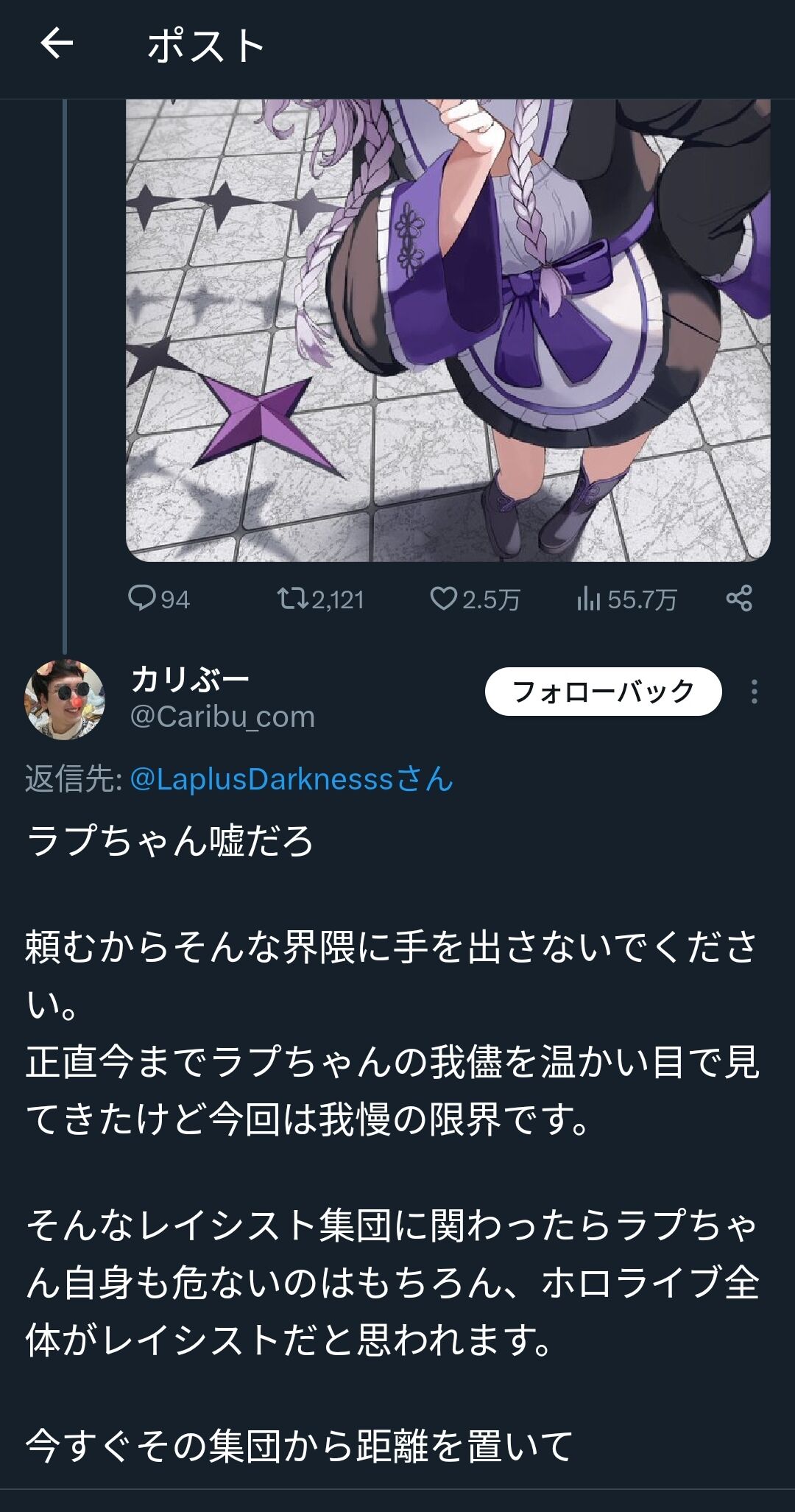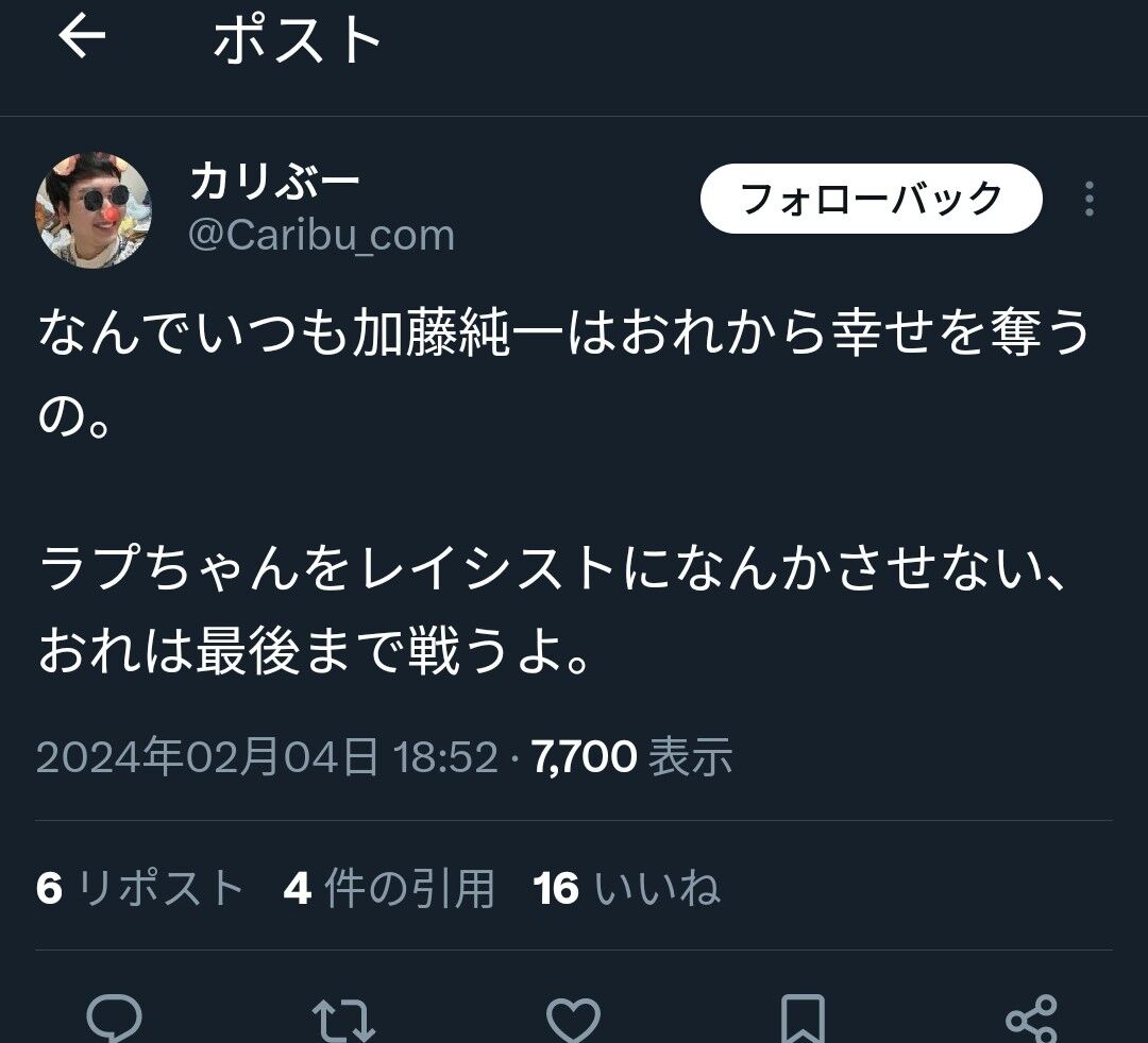 【火の玉ストレート】Vtuberラプ様、弱者男性を煽る〈クリスマス予定〉 2023年12月26日 カテゴリ:ホロライブ ラプラス・ダークネス ラプラス・ダークネス(5月25日 - )は、日本のバーチャルYouTuber、バーチャルアイドル。所属事務所はホロライブプロダクションで、同事務所の女性バーチャルYouTuberグループ・ホロライブの6期生「秘密結社holoX」を統べる総帥。愛称は「ラプ様」「ラプsama」「総帥」「ラプラス… 15キロバイト (1,778 語) - 2023年12月2日 (土) 19:04 (出典 m.media-amazon.com) (出典 【悲報】Vtuberさん、遂に弱、者男性を煽ってしまう……)1 それでも動く名無し :2023/12/25(月) 12:15:21.98ID:Pcr1Qfc60XMAShttps://twitter.com/LaplusDarknesss/status/1738881117959389303(出典 i.imgur.com)(出典 【悲報】Vtuberさん、遂に弱、者男性を煽ってしまう……) 【【火の玉ストレート】Vtuberラプ様、弱者男性を煽る〈クリスマス予定〉】の続きを読む タグ :#ホロライブ#ラプラスダークネス